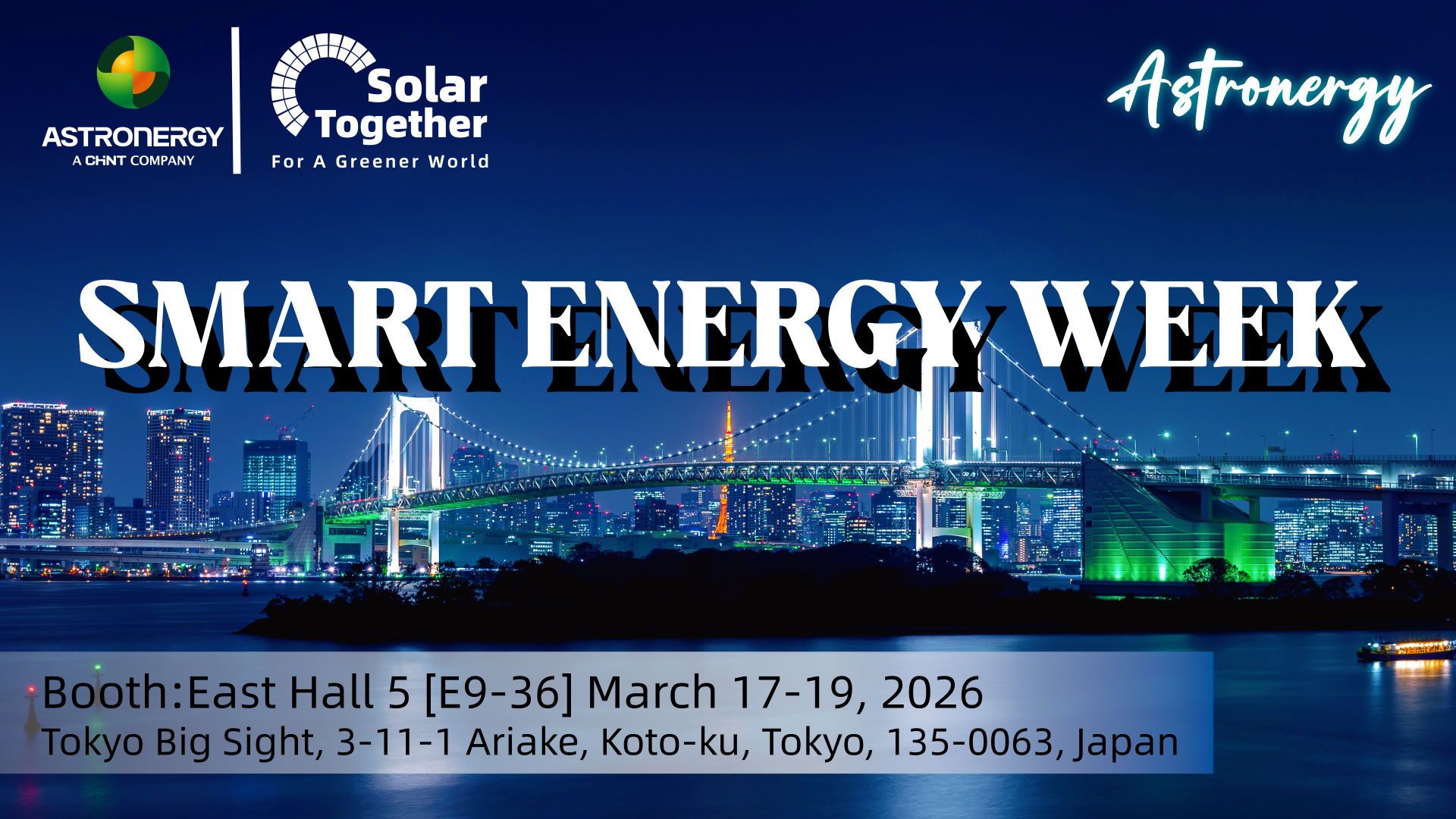 CHINT NEW ENERGY JAPAN株式会社(Astronergy)は、2026年3月17日(火)~3月19日(木)に東京ビッグサイトで開催される「SMART ENERGY WEEK 春 2026(WSEW Spring 2026)」に出展いたします。